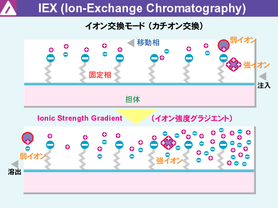 イオン結合を形成している溶質-固定相間の結合を切断するにはグラジエント溶出法を用いて移動相中の塩濃度(イオン強度)を上昇させます。移動相中のイオンが溶質や固定相にそれぞれイオン結合する結果、溶質は固定相から離れていきます。このは離れ方は溶質イオンの強さによって異なるため、一般に弱いイオンのほうが強いイオンよりも早く溶出することにより分離が可能となります。